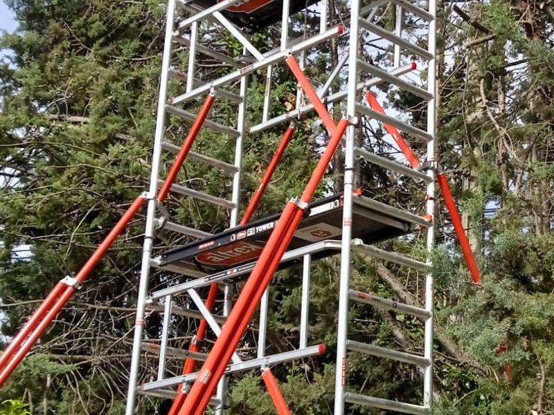 Para este tipo de trabajos utilizamos andamios homologados, de aluminio y con tirantes de seguridad. Trabajamos con todas las medidas de protección necesarias, haciendo un correcto uso de arneses, cascos, calzado, gafas y guantes apropiados. Son trabajos delicados y la seguridad es lo más importante.